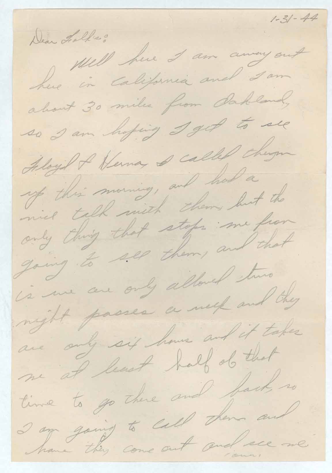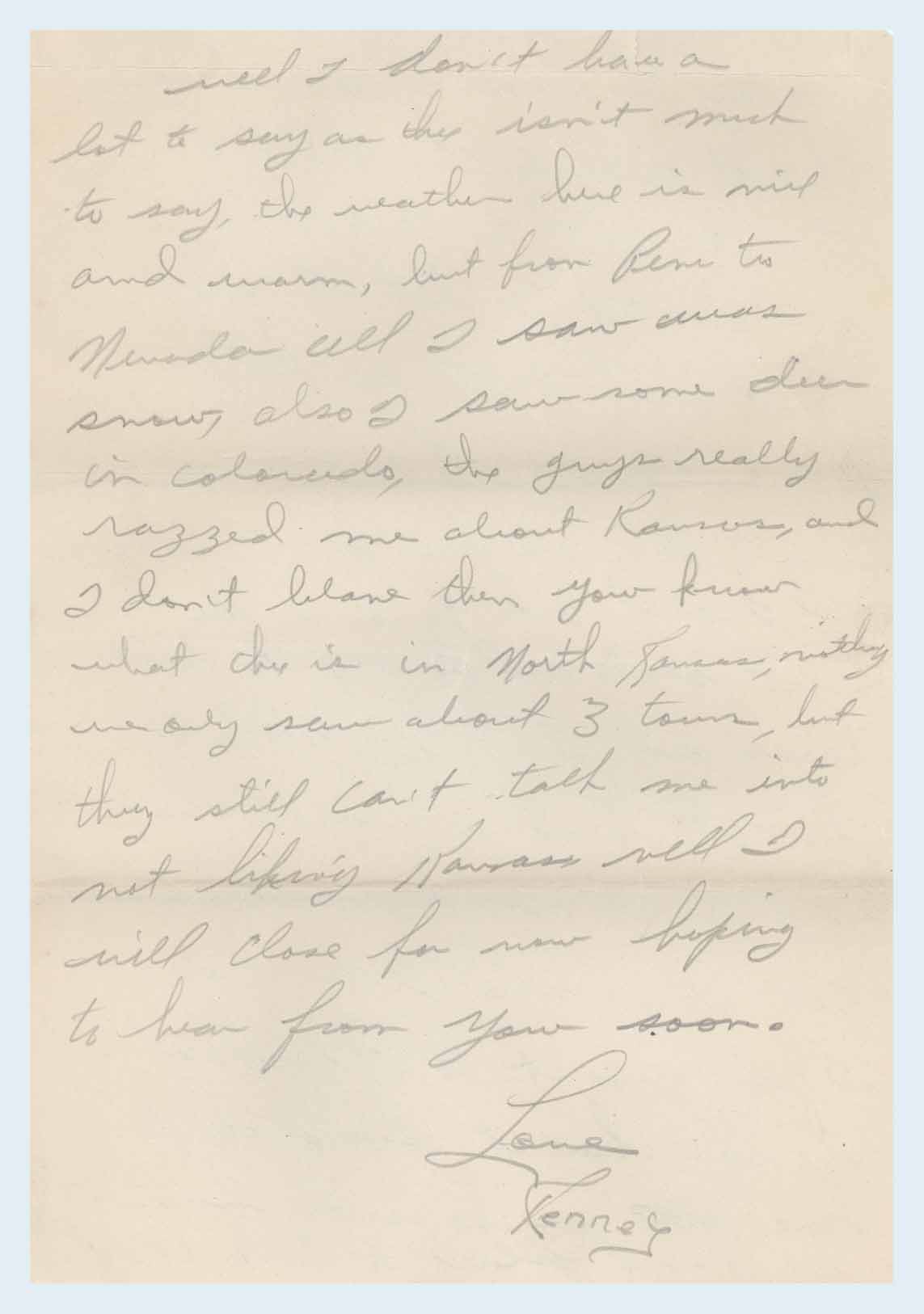 well I don’t have a lot to say as thre [sic] isn’t much to say, the weather here is nice and warm, but from Penn to Nevada all I saw was snow, also I saw some deer in Colorado, the guys really razzed me about Kansas, and I don’t blane [sic] them you know what thre [sic] is in North Kansas, nothing we only saw about 3 towns, but they still can’t talk me into not liking Kansas, well I will close for now hoping to hear from you soon.