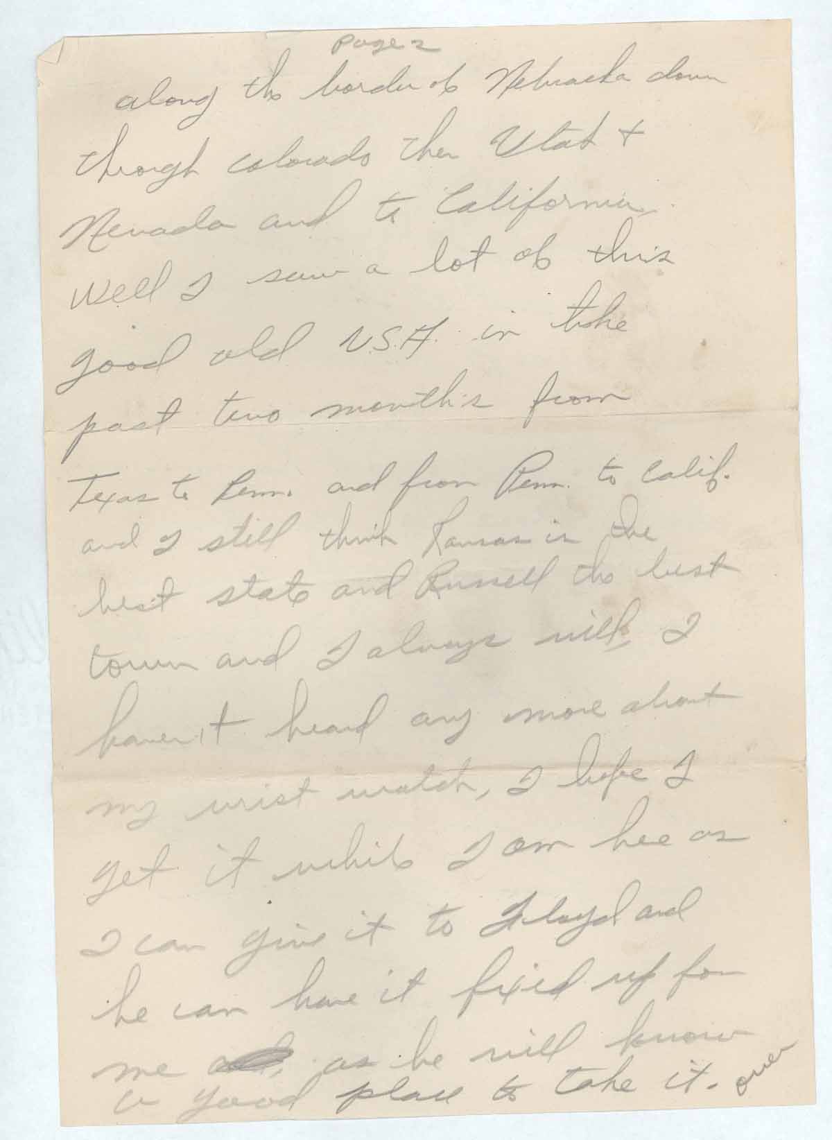 along the border of Nebraska down through Colorado then Utah & Nevada and to California, Well I saw a lot of this good old U.S.A. in the past two month’s from Texas to Penn. and from Penn. to Calif. and I still think Kansas is the best state and Russell the best town and I always will, I haven’t heard any more about my wrist watch, I hope I get it while I am here as I can give it to Floyd and he can have it fixed up for me [scratch out], as he will know a good place to take it,