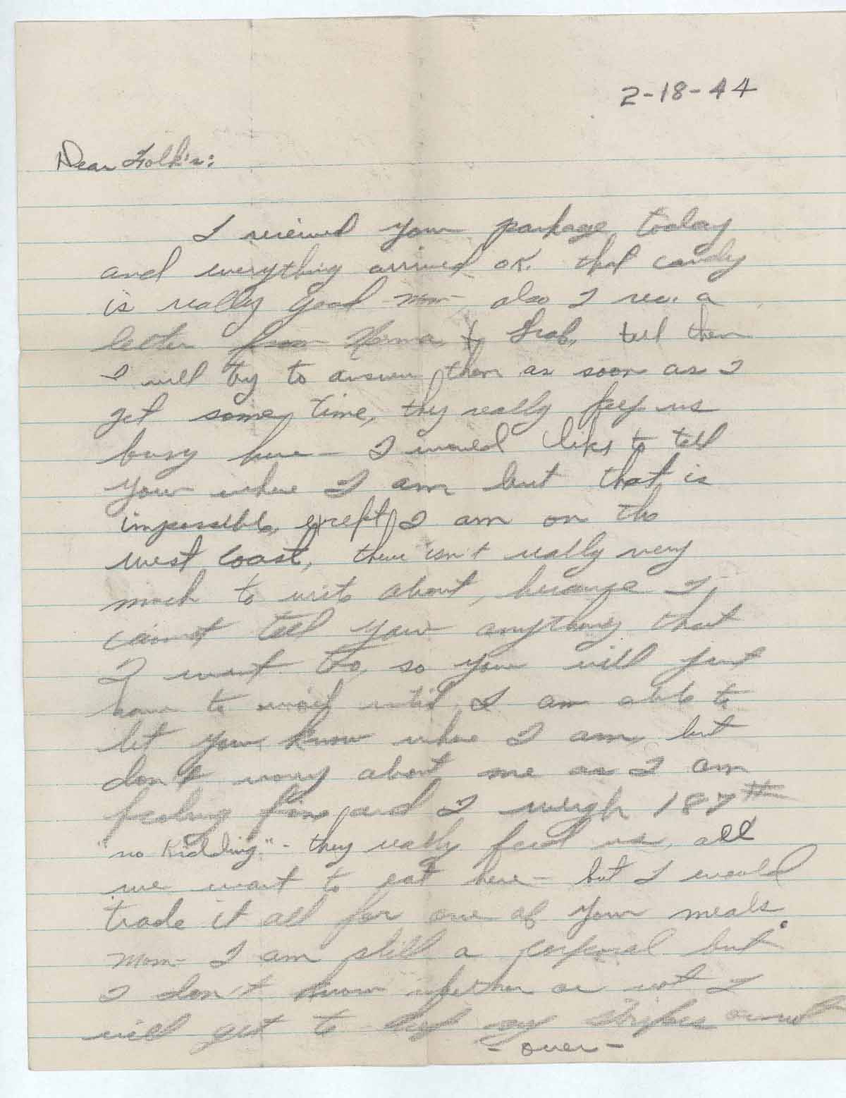 I received your package today and everything arrived ok. That candy is really good –mom-, also I rec. a letter from Norma & Srab [not sure about name], tell them I will try to answer them as soon as I get some time, they really keep us busy here- I would like to tell you where I am but that is impossible, except I am on the west coast, there isn’t really very much to write about, because I can’t tell you anything that I want too, so you will just have to wait until I am able to let you know where I am, but don’t worry about me as I am feeling fine and I weigh 187# “no Kidding.: - they really feed us, all we want to eat here – but I would trade it all for one of your meals Mom- I am still a corporal but I don’t know whether or not I will get to keep my stripes or not