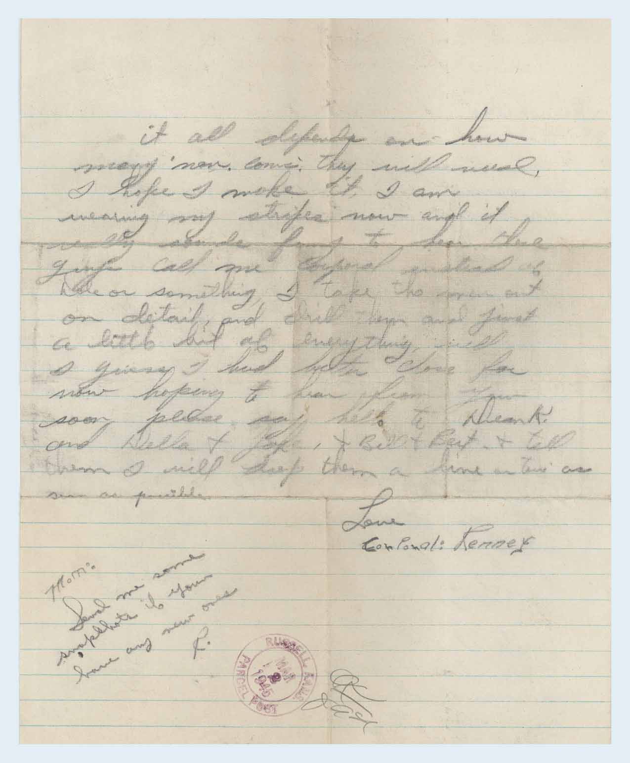 It all depends on how many non. coms: they will need, I hope I make it, I am wearing my stripes now and it really sounds funny to hear these guys call me Corporal instead of Dole or something, I take the men out on detail, and drill them and just a little bit of everything, well I guess I had better close for now hoping to hear from you soon please say hello to Dean K. and Della & Jake, & Bill & Bert. & tell them I will drop them a line in time as soon as possible.