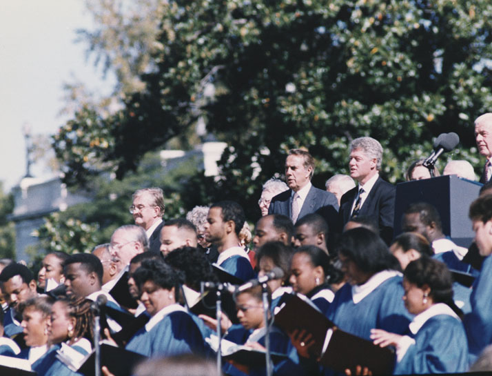 Item 2: Dole and Clinton on outdoor dais listening to choir singing. 10/23/1993.