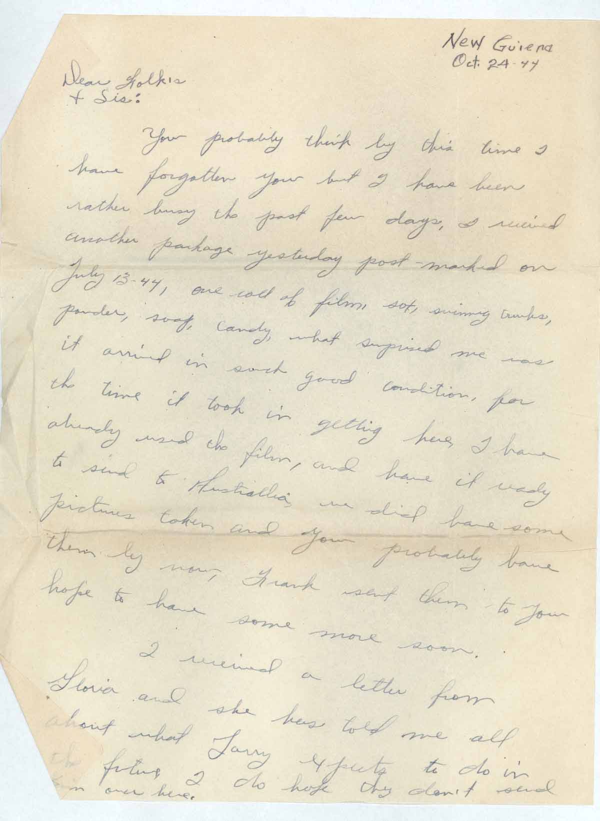 You probably think by this time I have forgotten you but I have been rather busy the past few days, I received another package yesterday post-marked on July 13-44, one roll of film, sox, swimming trunks, powder, soap, candy, what surprised me was it arrived in such good condition, for the time it took in getting here, I have already used the film, and have it ready to send to Australia, we did have some pictures taken and you probably have them by now, Frank sent them to you hope to have some more soon.