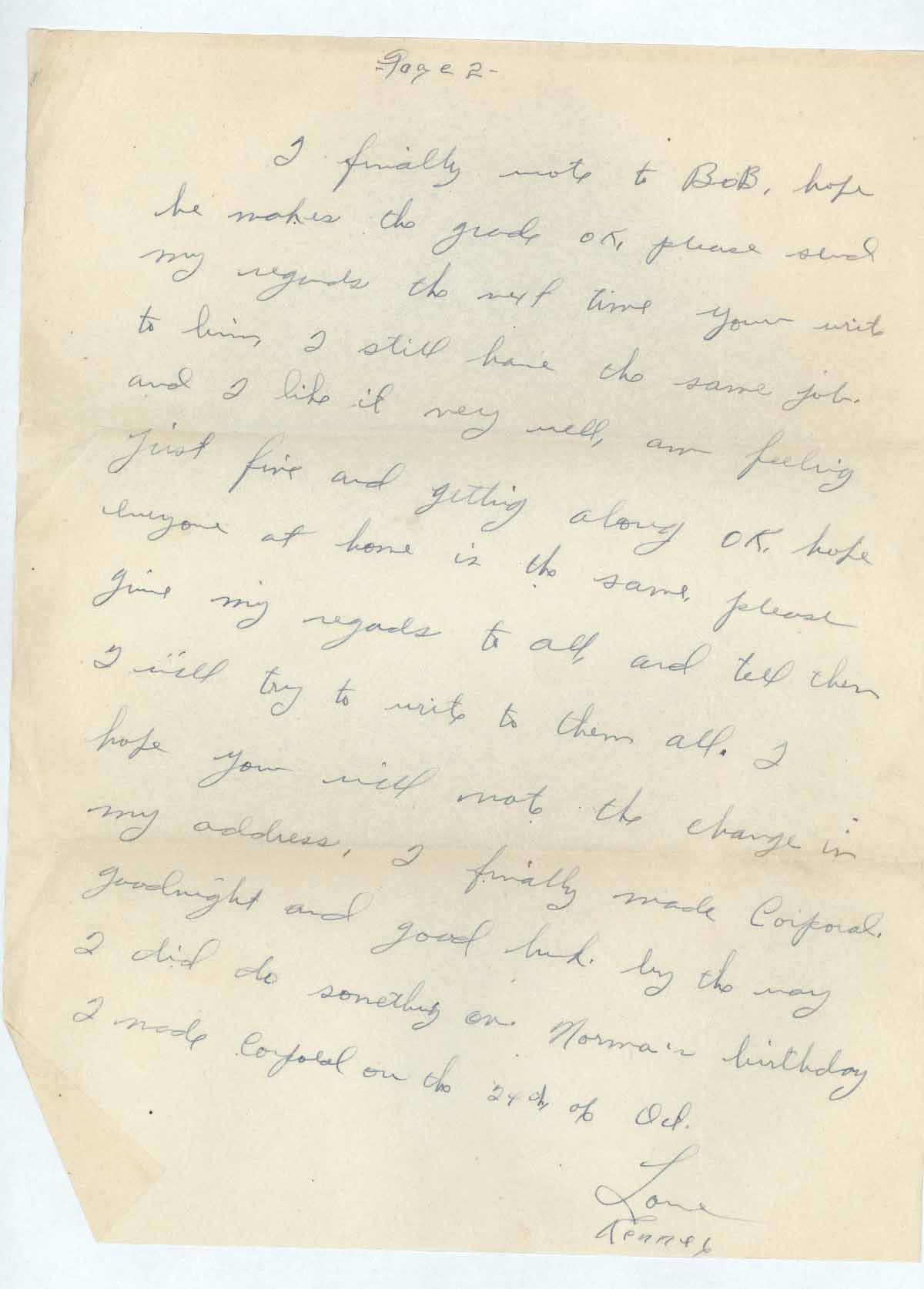 I finally wrote to Bob, hope he makes the grade OK, please send my regards the next time you write to him, I still gave the same job, and I like it very well, am feeling just fine and getting along OK. hope everyone at home is the same please give my regards to all, and tell them I will try to write to them all. I hope you will note the change in my address, I finally made Corporal. goodnight [sic] and good luck, by the way I did do something on Norma’s birthday I made corporal on the 24th of Oct.