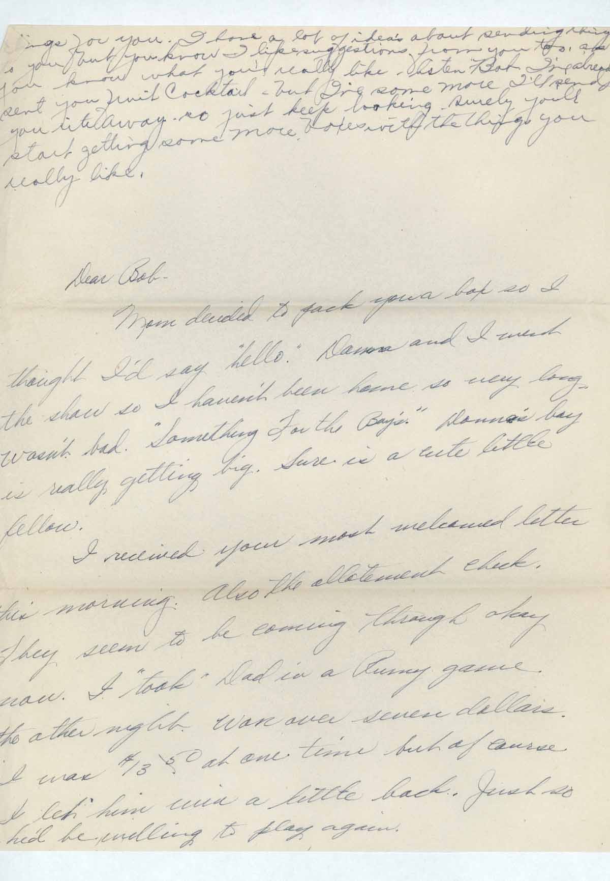 Mom decided to pack you a box so I thought I’d say “hello.” Donna and I went [to] the show so I haven’t been home so very long wasn’t bad “Something For the Boys.” Donna’s boy is really getting big. Sure is a cute little fellow.