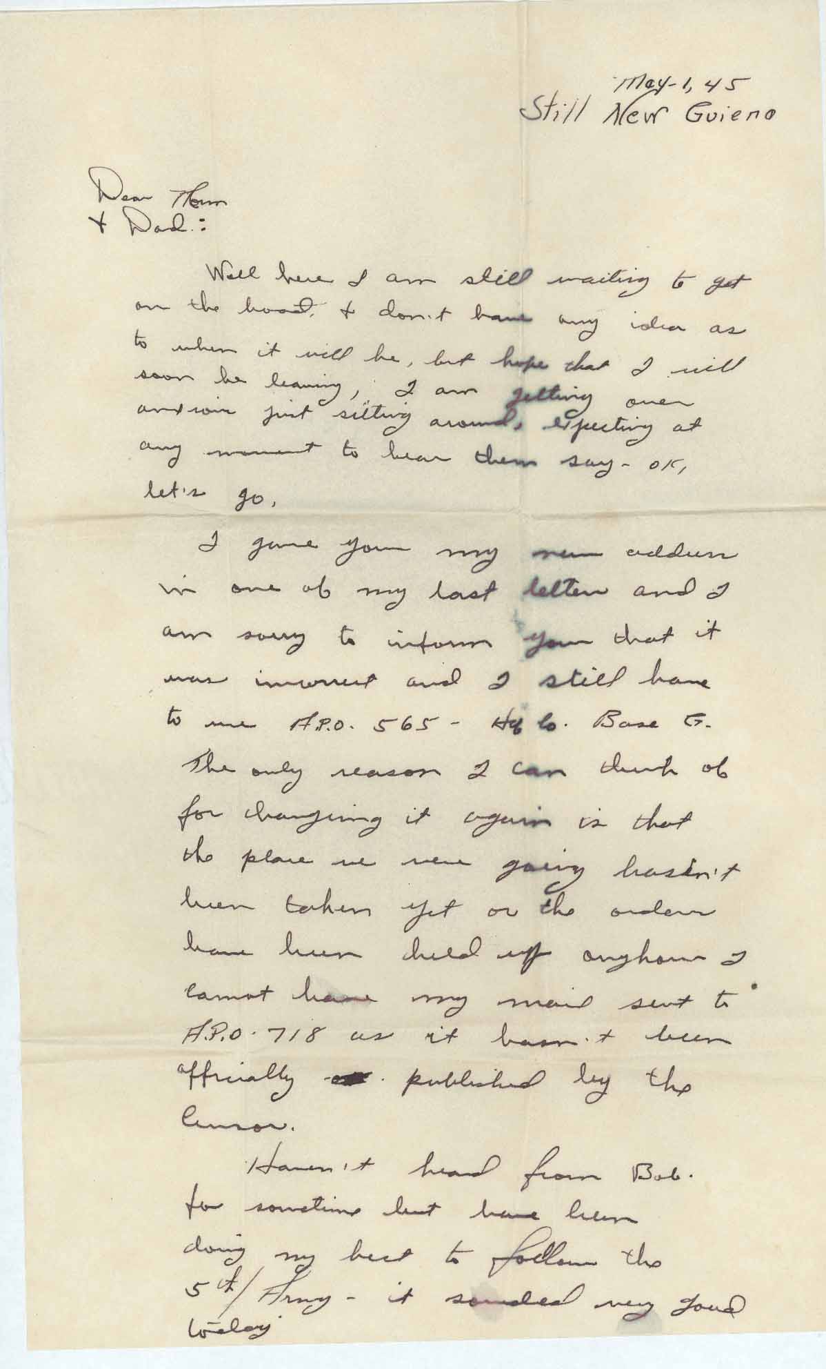 I gave you my new address in one of my last letters and I am sorry to inform you that it was incorrect and I still have to use A.P.O. 565- Hq. Co. Base G. The only reason I can think of for changing it again is that the place we were going hasn’t been taken yet or the orders have been held up anyhow I cannot have my mail sent to A.P.O 718 as it hasn’t been officially – published by the Curror [sic].