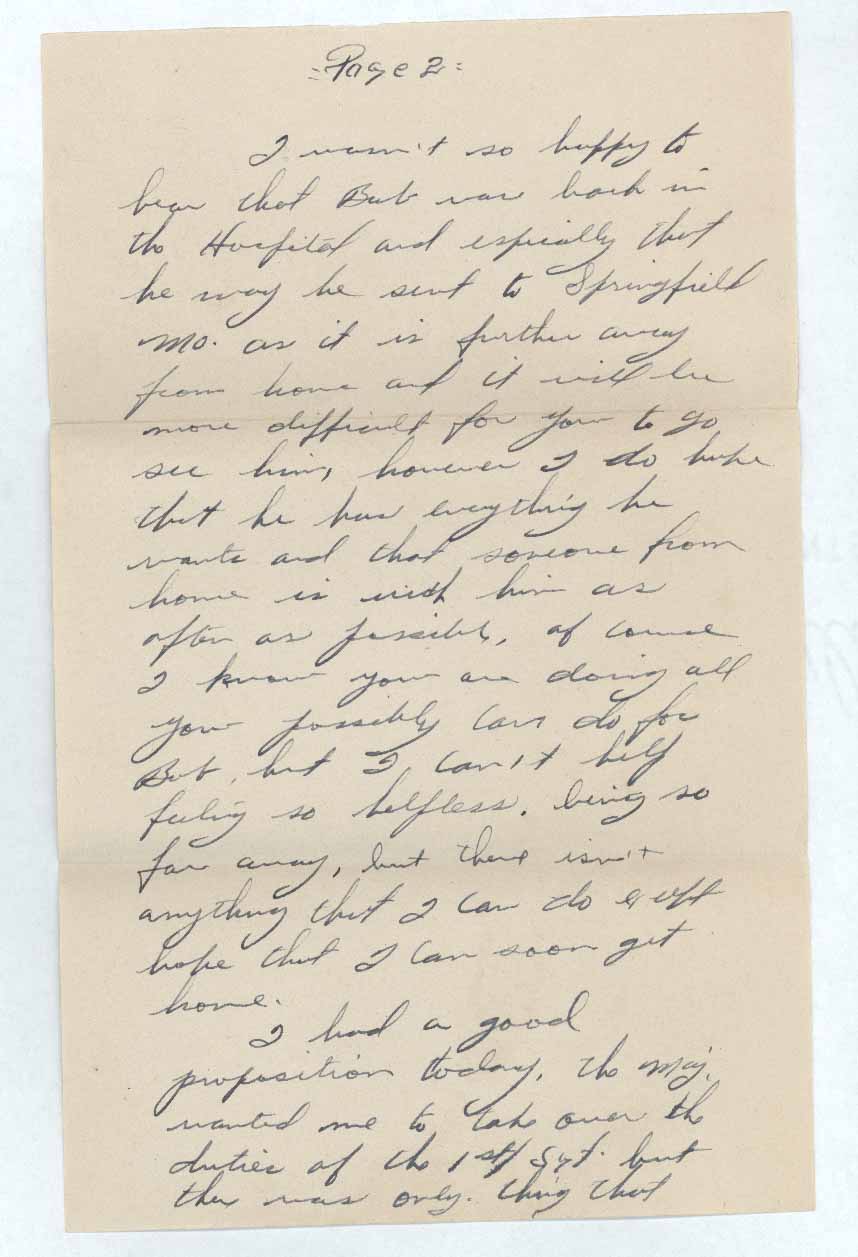 I wasn’t so happy to hear that Bob was back in the Hospital and especially that he may be sent to Springfield MO. as it is further away from home and it will be more difficult for you to go see him, however I do hope that he has everything he wants and that someone from home is with him as often as possible, of course I know you are doing all you possibility can do for Bob, but I can’t help feeling so helpless, being so far away, but there isn’t anything that I can so except hope that I can soon get home.