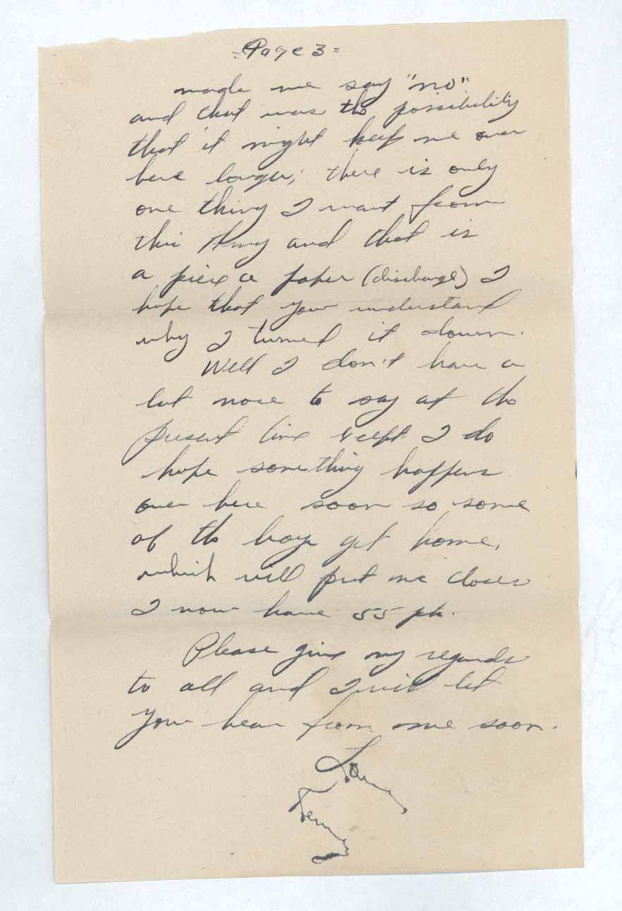 made me say “no” and that was the possibility that it might keep me over here longer; there is only one thing I want from this Army and that is a piece a Japer (discharge) I hope that you understand why I turned it down.