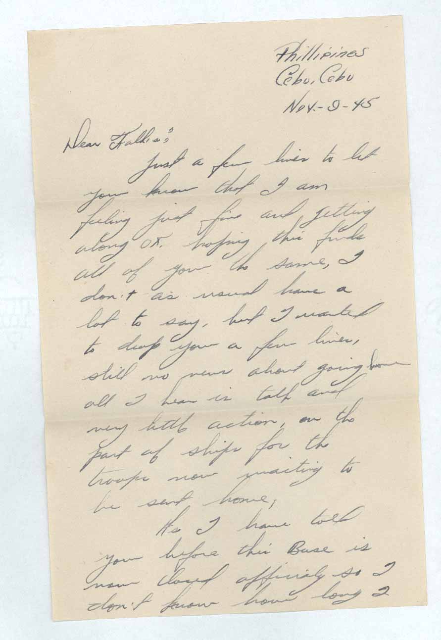 Just a few lines to let you know that I am feeling just fine and getting along OK. hoping this finds all of you the same, I don’t as usual have a lot to say, but I wanted to drop you a few lines, still no news about going home all I hear is talk and very little action, on the part of ships for the troops now waiting to be sent home,