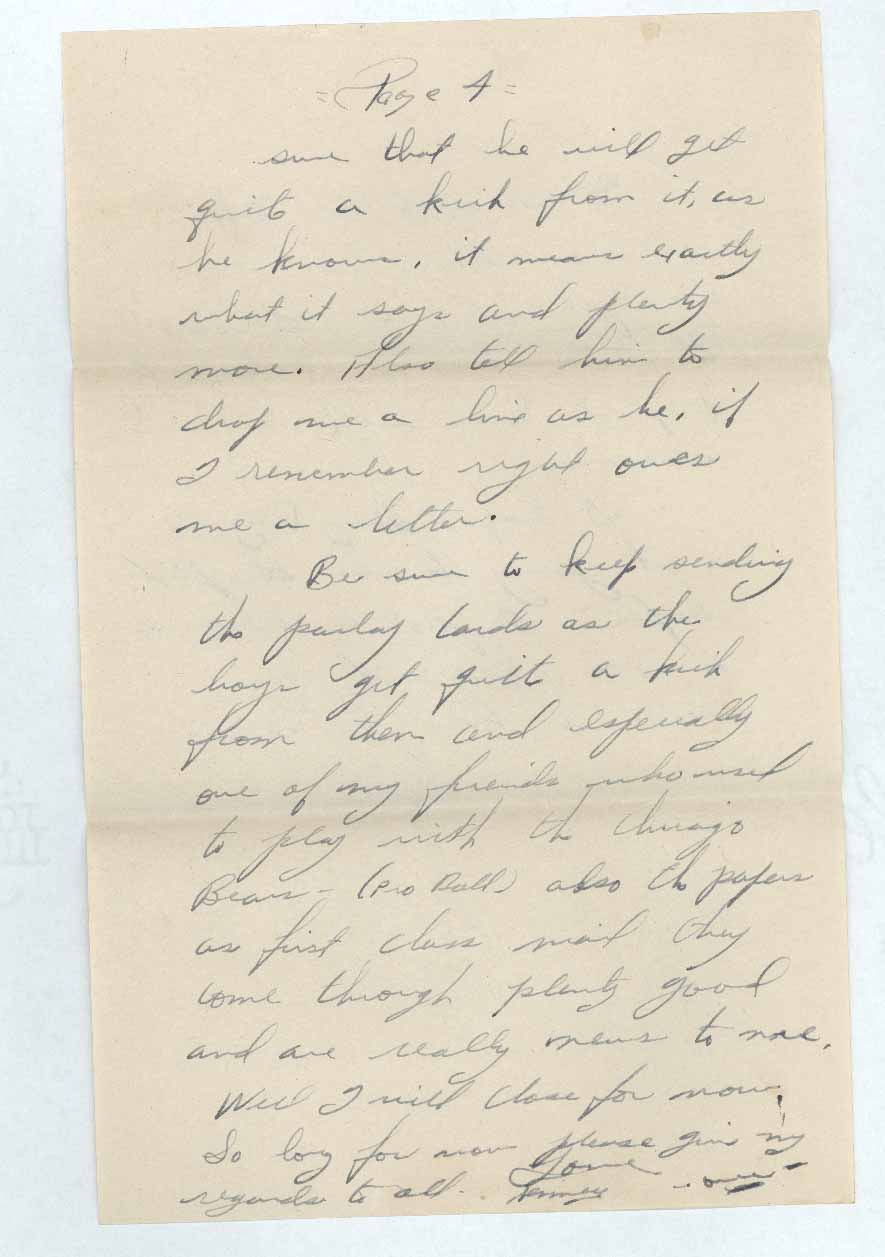 Be sure to keep sending the party cards as the boys get quite a kick from then [sic] and especially one of my friends who used to play with the Chicago Bears- (pro Ball) also the papers as first class mail they come through plenty good and are really news to me.