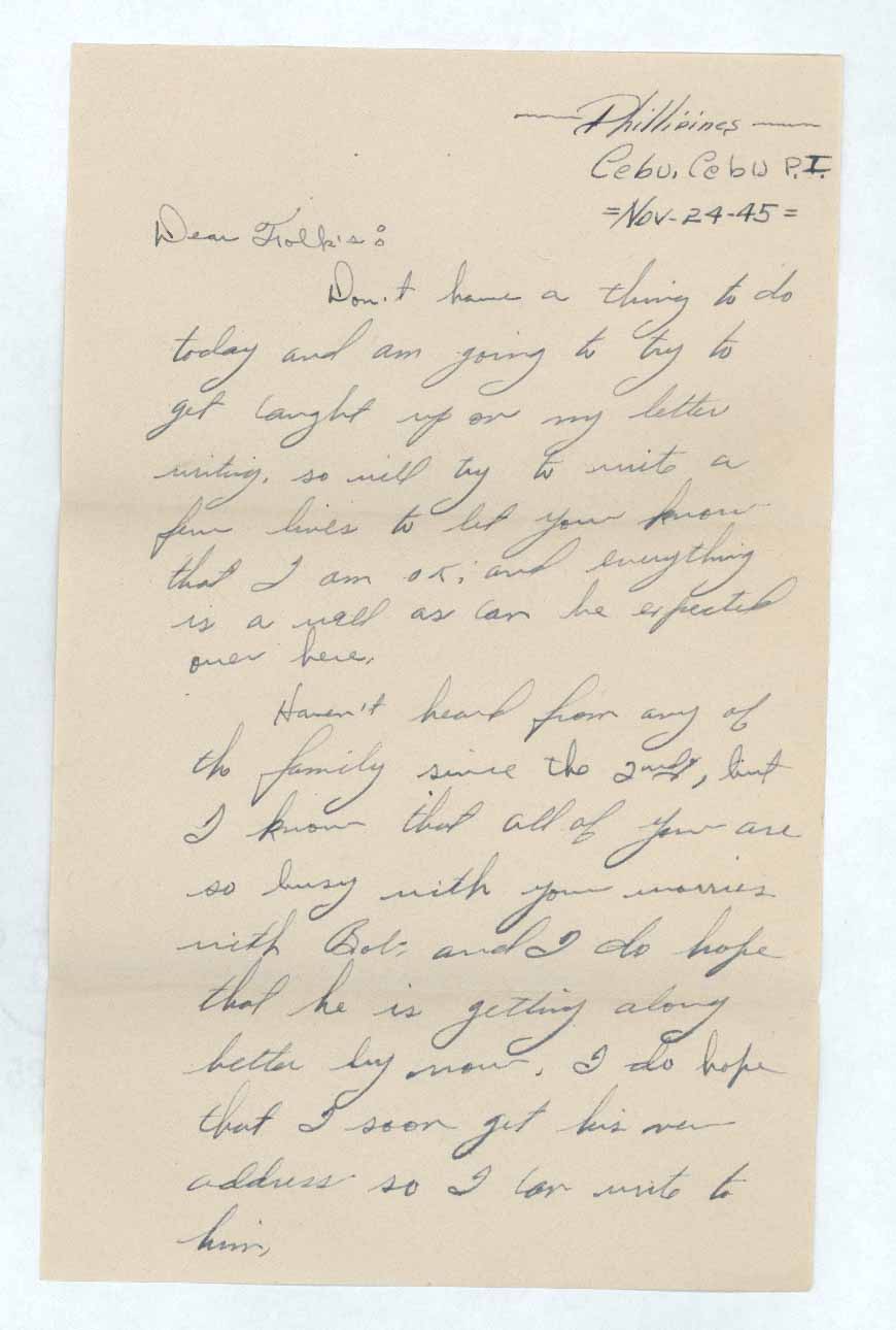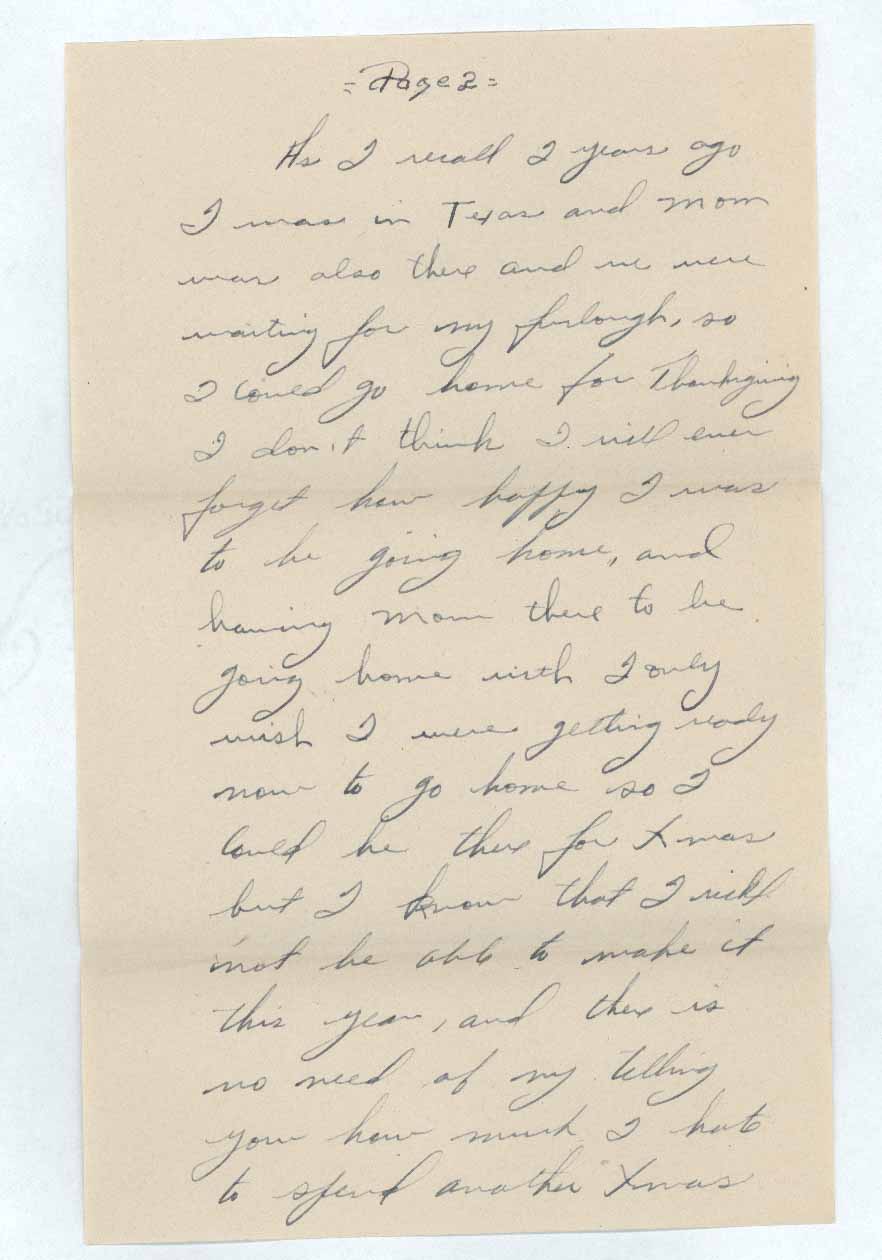 As I recall 2 years ago I was in Texas and mom [sic] was also there and we were waiting for my furlough, so I could go home for Thanksgiving I don’t think I will ever forget how happy I was to be going home, and having Mom there to be going home with I only wish I were getting ready now to go home so I could be there for Xmas but I know that I will not be able to make it this year, and there is no need of my telling you how much I hate to spend another Xmas