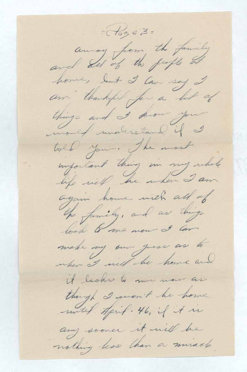 away from the family and all of the people at home, but I can say I am thankful for a lot of things and I know you would understand if I told you. The most important thing in my whole life will be when I am again home with all of the family, and as things look to me now I can make my own guess as to when I will be home and it looks to me now as though I won’t be home until April 46, if it is any sooner it will be nothing less than a miracle