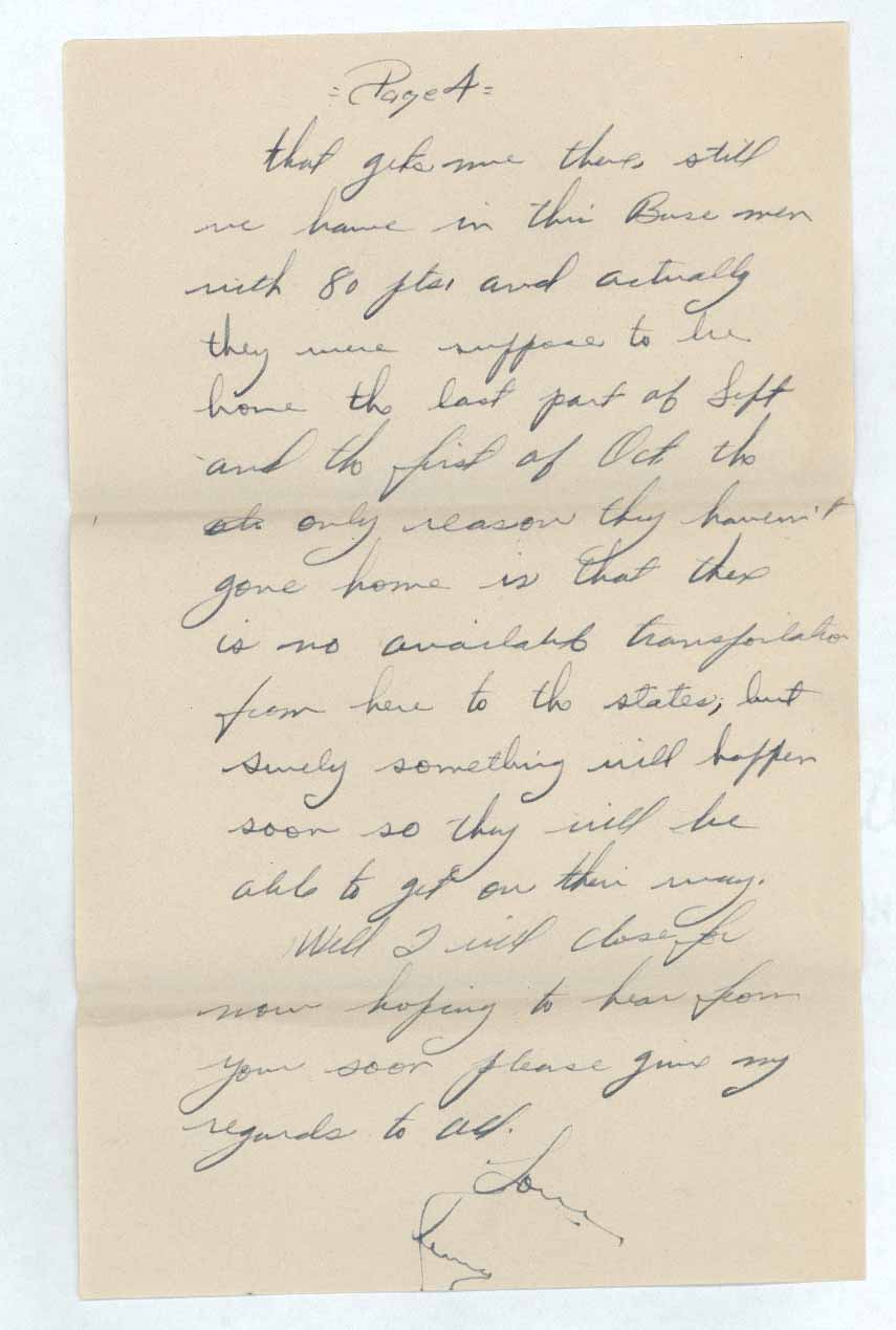 that gets me there, still we have in this Base men with 80 pts, and actually they were suppose to be home the last part of Sept and the first of Oct. the at only reason they haven’t gone home is that there is no available transportation from here to the states, but surely something will happen soon so they will be able to get on their way.