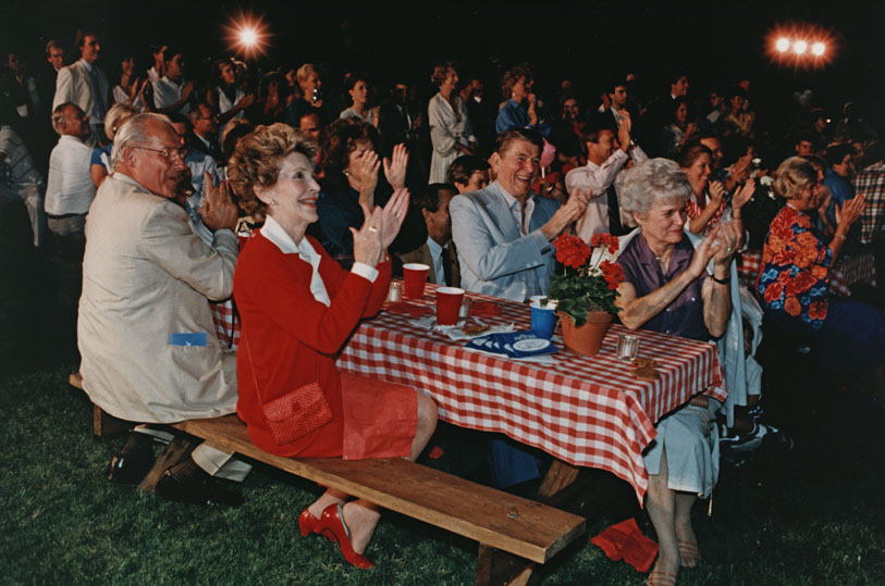 Item 5: President Reagan and others clapping. 8/14/1986. Michel, Robert H., 1923-; Reagan, Nancy, 1923-; Dole, Elizabeth Hanford; Reagan, Ronald; Unidentified woman; Group seated at picnic table smiling and clapping.