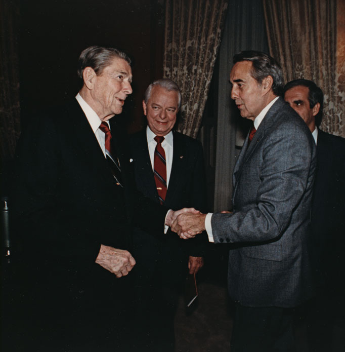 Reagan, Ronald; Byrd, Robert C., 1917-; Dole, Robert J., 1923-; Coelho, Tony, 1942-; Bob Dole and President Ronald Reagan shaking hands at the State of the Union Night