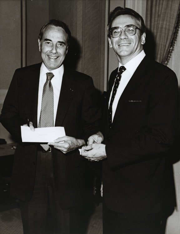 Senator Dole holding envelope with Dave Duvall