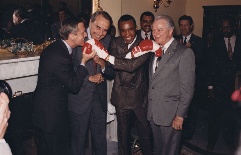 Senators Bob Dole and Robert Byrd meeting Sugar Ray Leonard, 1987