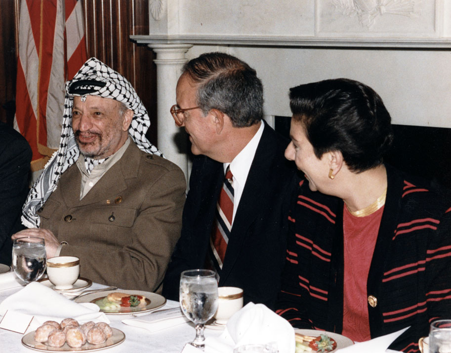 Yasser Arafat sits at table conversing with George Mitchell | Dole Archive Collections