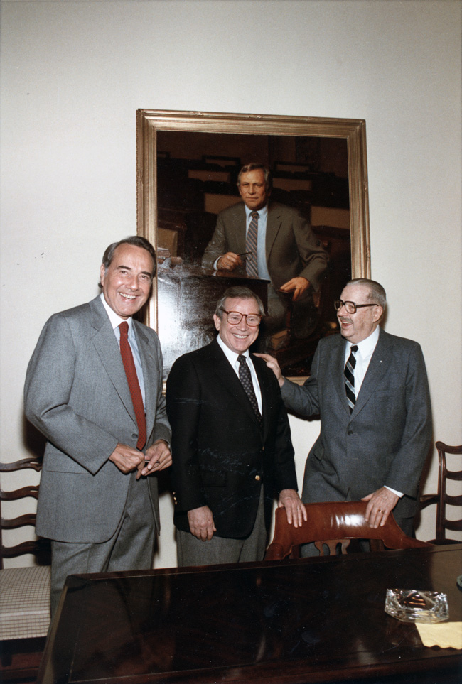 Bob Dole, Howard Baker, and Hugh Scott standing behind table at unidentified reception | Dole Archive Collections