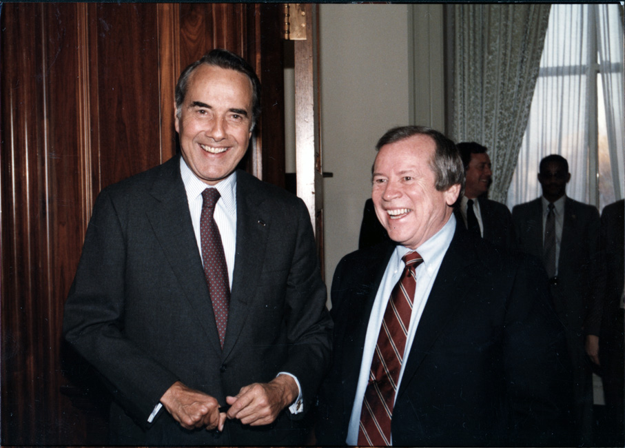 Bob Dole and Howard Baker laughing in doorway | Dole Archive Collections