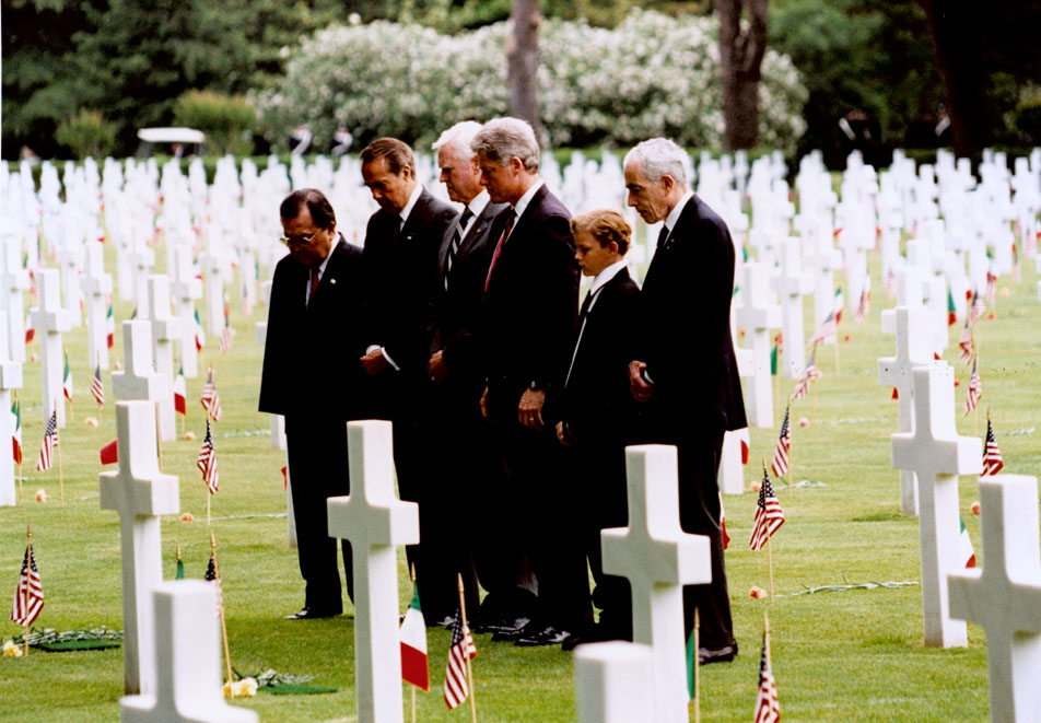Dole and Clinton with Heads bowed at Normandy Gravesite | Dole Archive Collections