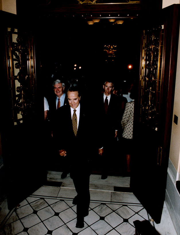 Item 1: Dole Walking Out of Senate After Announcing Retirement. 6/11/1996. Color, 8" x 10", Dole, Robert J., 1923-; walking out of senate after speech.