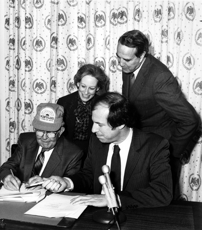 Nancy Kassebaum-Baker and Bob Dole watching a paper being signed | Dole Archive Collections