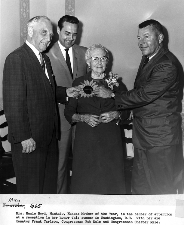 Item 6: Mamie Body at her Mother of the Year reception, along with Frank Carlson, Bob Dole, and Chester Mize. Inscriptions: Mrs. Mamie Boyd, Mankato, Kansas Mother of the Year, is the center of attention at a reception in her honor this summer in Washington, D.C. With her are Senator Frank Carlson and Congressmen Bob Dole and Chester Mize.