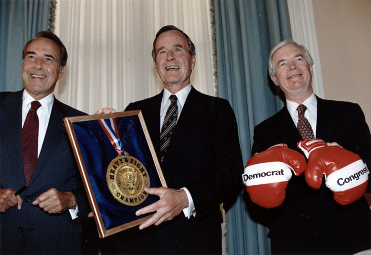 Dole, Bush and Cochran with "Heavyweight Champion" medal | Dole Archive Collections