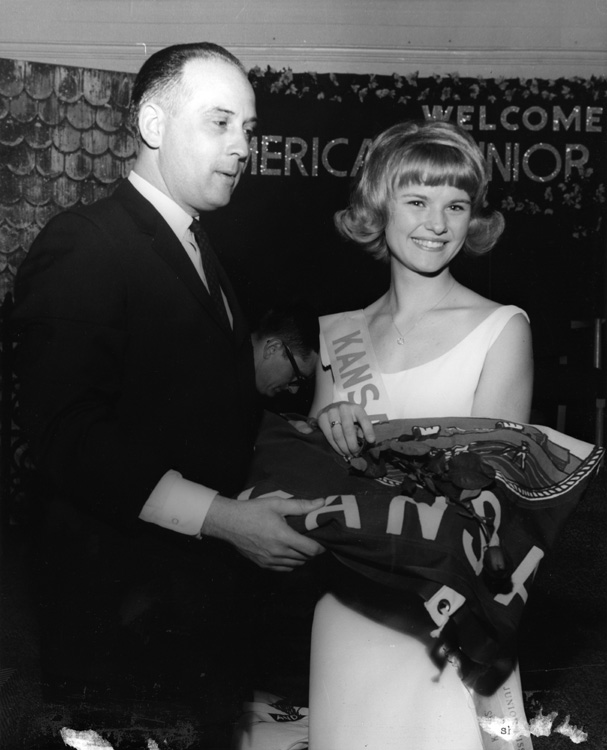 Inscriptions: Cong. Jack Edwards of Alabama presents KS flag to Karen Anderson, 1966 Kansas Jr. Miss, at America's Junior Miss Pageant in Mobile, Alabama