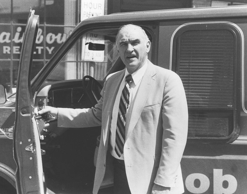 Item 1: Don Fambrough next to vehicle. 4/25/1984. Inscriptions: Back: Don Fambrough (former KU coach) Bob Dole's representative in Kansas 25 April 1984.