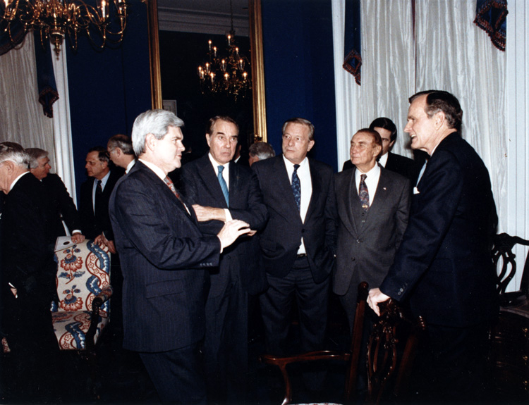 Newt Gingrich conversing with Bob Dole, Strom Thurmond and George H.W. Bush