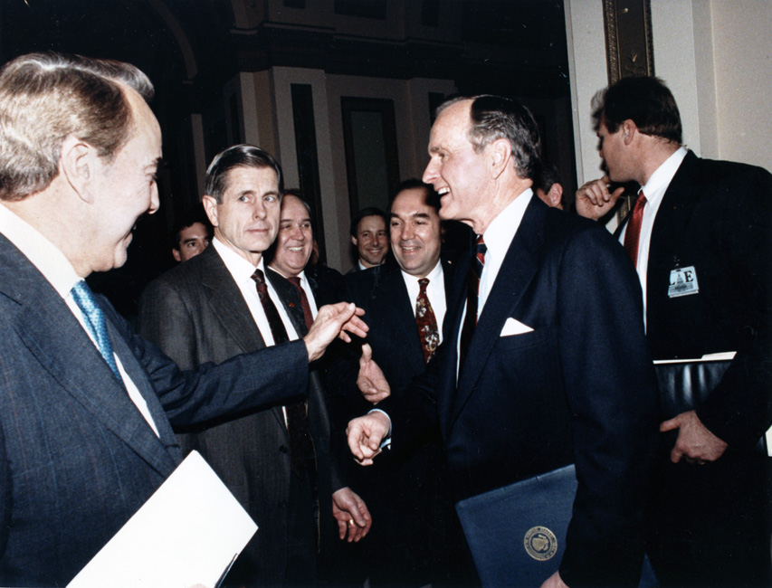 Bob Dole shaking hands as George H.W. Bush talks, pose 2 | Dole Archive Collections