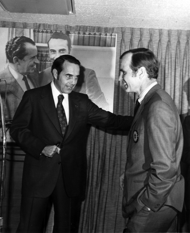 Item 5: Bob Dole and George H.W. Bush standing on stage in front of projection of Richard Nixon and Bob Dole. 4/17/1973.