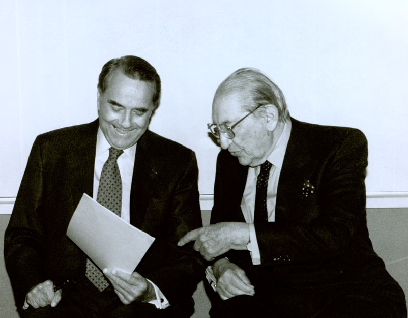 Sen. Dole with Max Fisher, honorary finance chairman of BDFP, discussing moving US Embassy in Israel from Tel Aviv to Jerusalem