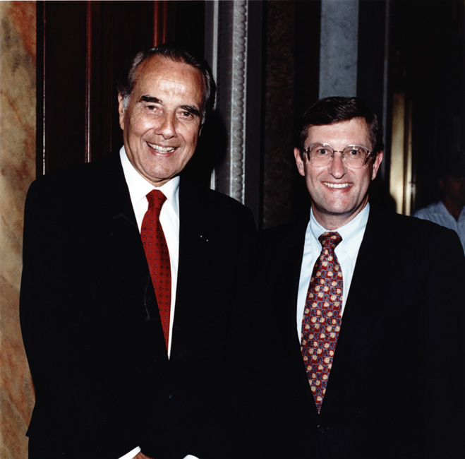 Dole, Robert J., 1923-; Conrad, Kent, 1948-. Bob Dole is posed with Senator Kent Conrad. There is an unidentified person in the background.