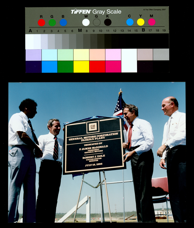 Dole standing next to GM Fairfax plant dedication sign | Dole Archive Collections