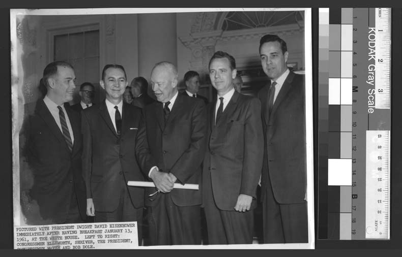 Inscriptions: Front: Pictured with President Dwight David Eisenhower immediately after having breakfast January 13, 1961, at the White House. Left to right: Congressmen Ellsworth, Shriver, the President, Congressmen McVey and Bob Dole