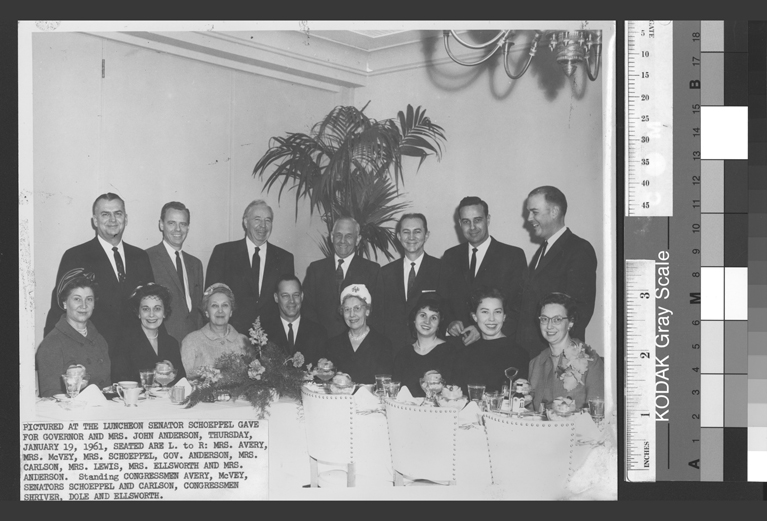 Notes: Front: Standing Congressmen Avery, McVey, Senators Schoeppel and Carlson, Congressmen Shriver, Dole and Ellsworth -- Inscriptions: Front: Pictured at the luncheon senator Schoeppel gave for governor and Mrs. John Anderson, Thursday,January 19, 1961, seated are L. to R: Mrs. Avery. Mrs McVey, Mrs Schoeppel, Gov Anderson, Mrs Carlson, Mrs Lewis, Mrs Ellsworth and Mrs Anderson.