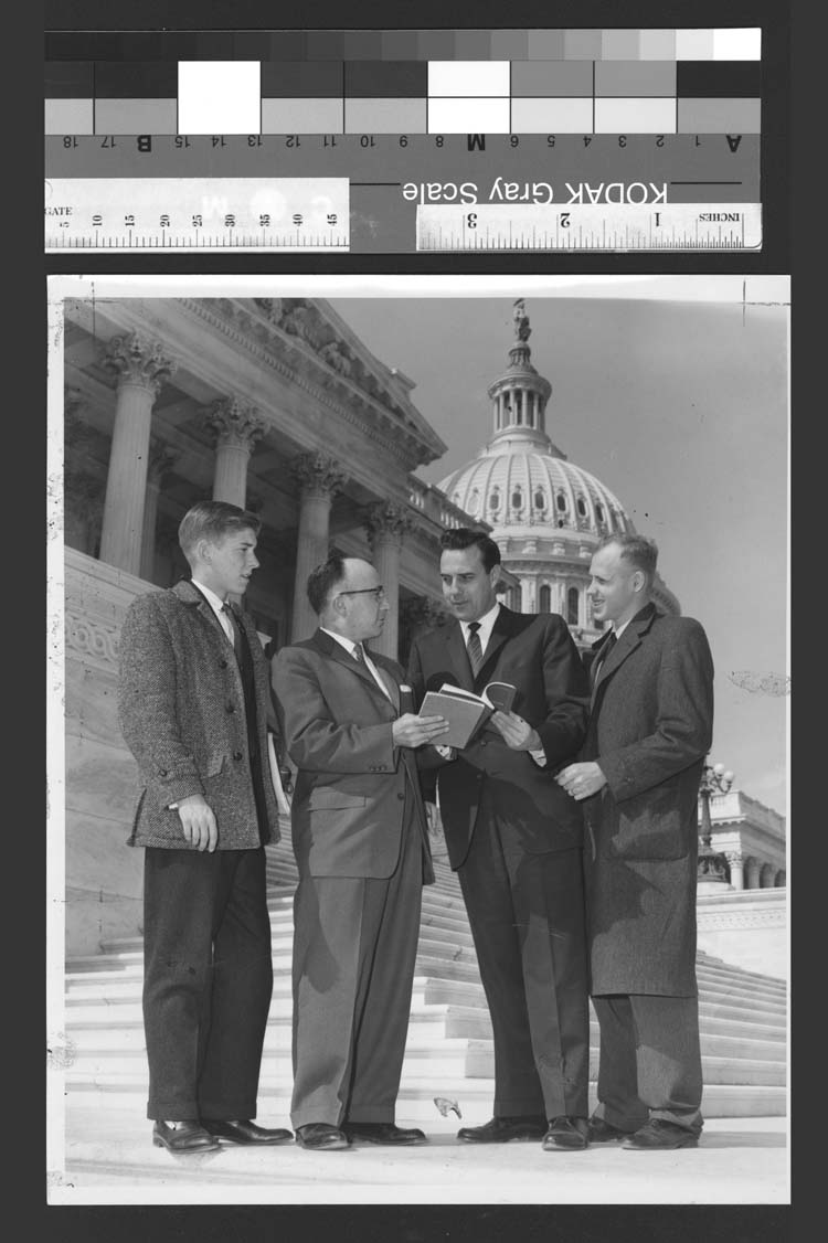Notes: Youth Fellowship seminar on peace and world order at the UN and were in Washington, D C for a few days. March 2, 1961 -- Inscriptions: Congressman Bob Dole (R. Kansas) is shown here on the steps of the US Capitol with Ward Lloyd of Kiowa, Rev Wesley H Davis of Jennings, and Rev Robert L McAllister of Cawker City. Congressman Dole's visitors were delegates to the Methodist
