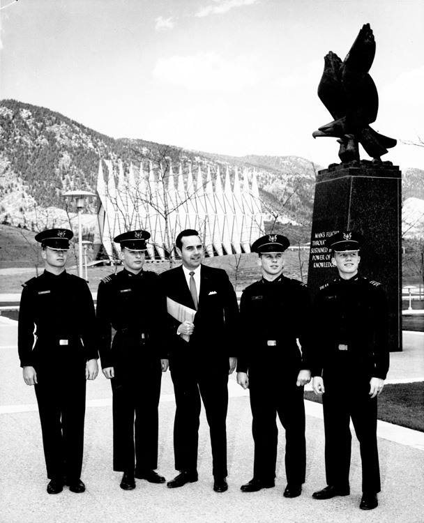 Item 1: Congressman Dole with four Air Force cadets in front of Academy statue, 1966-04-28