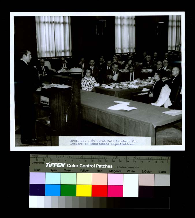 Dole, Robert J., 1923-; Addressing the attendees of the luncheon for leaders of handicapped organizations; Inscription on front: "APRIL 14, 1969--Bob Dole Luncheon for Leaders of Handicapped Organizations"