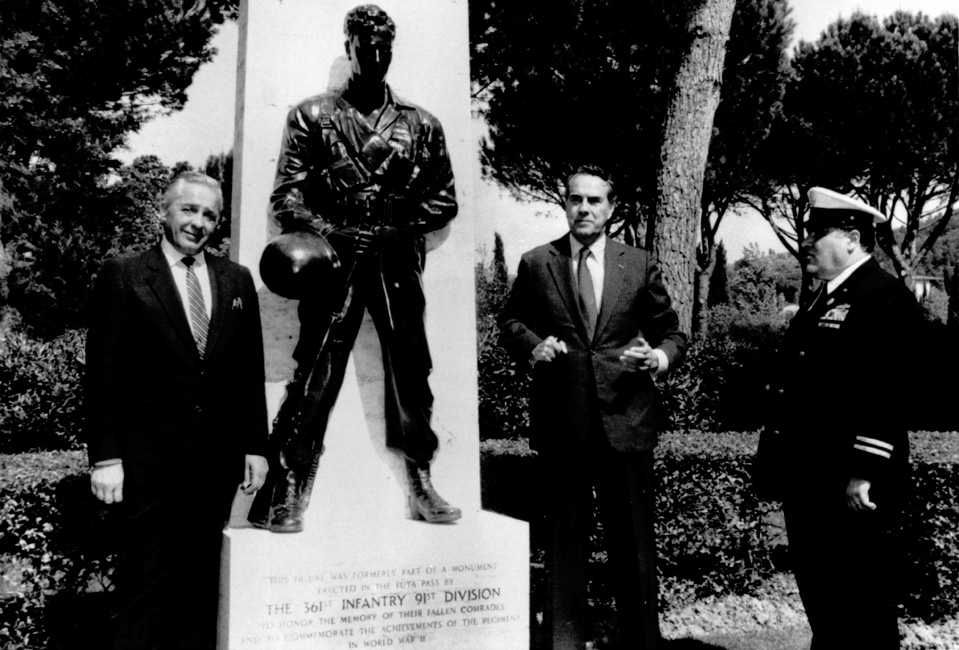Pistilli; Dole, Robert J., 1923-; unidentified Supt.; Posing by a WWII statue