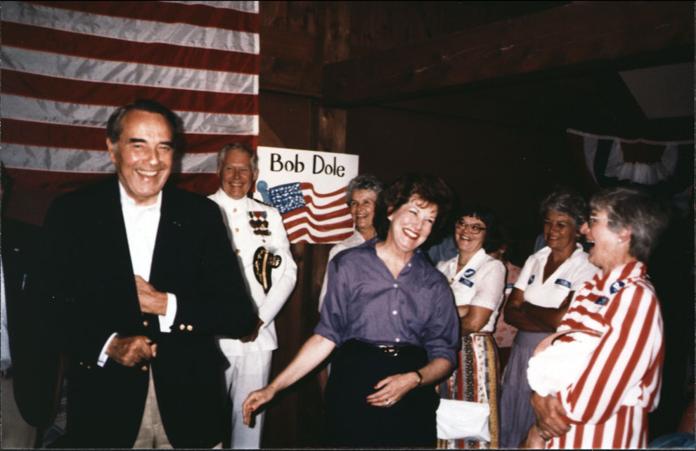 Bob and Elizabeth Dole laughing and smiling at reception