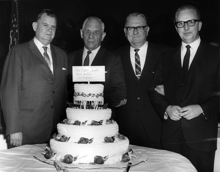 Frank Carlson and guests stand in front of birthday cake | Dole Archive Collections
