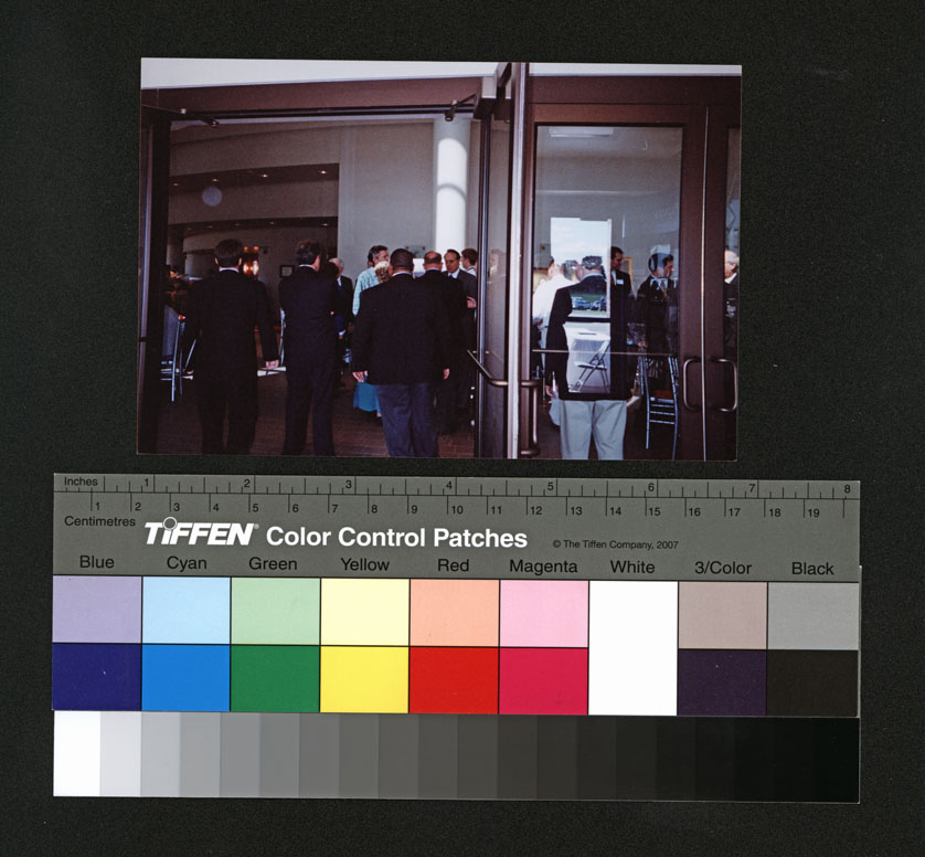 Senator Dole talks with a group of people at the Lied Center on the day of the groundbreaking of the Dole Institute of Politics. The groundbreaking was held on stage of the nearby Lied Center instead of at the Dole Institute because of inclement weather.