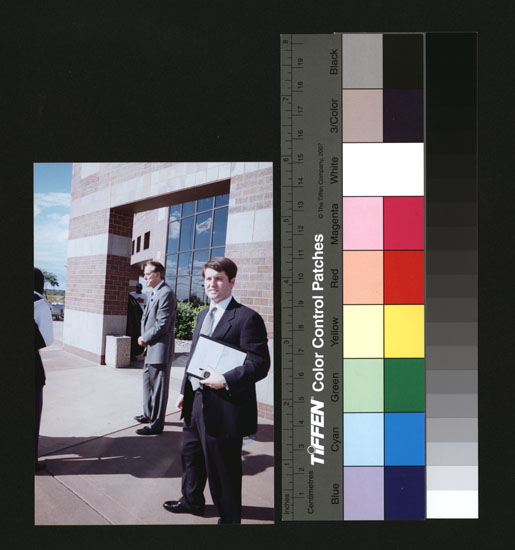 Dole is shown standing outside of the Lied Center with his Assistant, Mike Marshall on the day of the Dole Institute groundbreaking ceremony. The ceremony was held on stage at the Lied Center instead of at the Dole Institute site because of inclement weather.