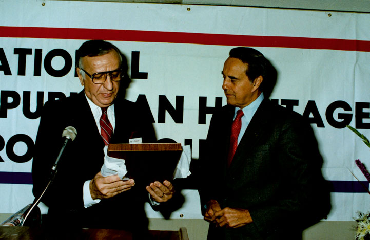 Color snapshot showing Frank D. Stella at microphone presenting the Eisenhower Award to Bob Dole.