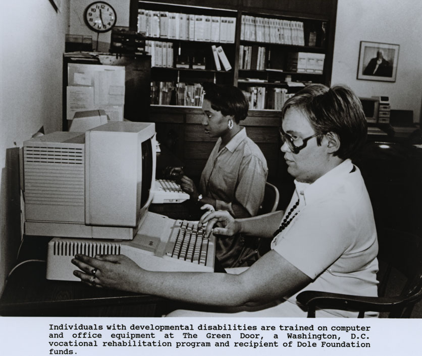 Two unidentified women; Typed on front: Individuals with developmental disabilities are trained on computer and office equipment at The Green Door, a Washington, D.C. vocational rehabilitation program and recipient of Dole Foundation funds