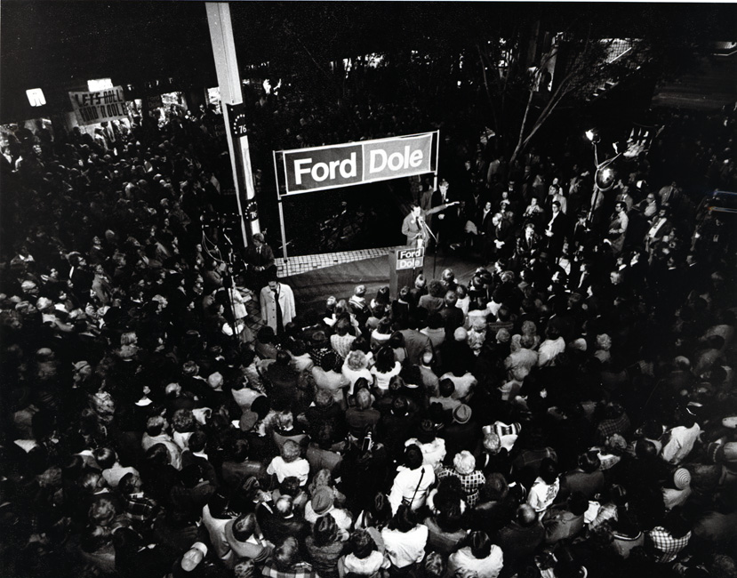 Dole, Robert J., 1923-; Bob Dole is giving a speech in front of a large crowd, on a stage with a Ford/Dole sign behind him. A Let's Roll Ford 'N Dole banner in upper left corner.