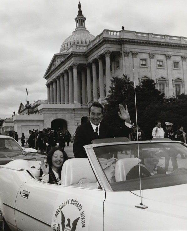 Dole, Robin; Dole, Robert J., 1923-; Senator Dole and Robin Dole waive to the camera as both sit in an open convertible in front of the U.S. Capitol building. The car has a label that states "President Richard Nixon." Members of the military stand behind them in the distance.